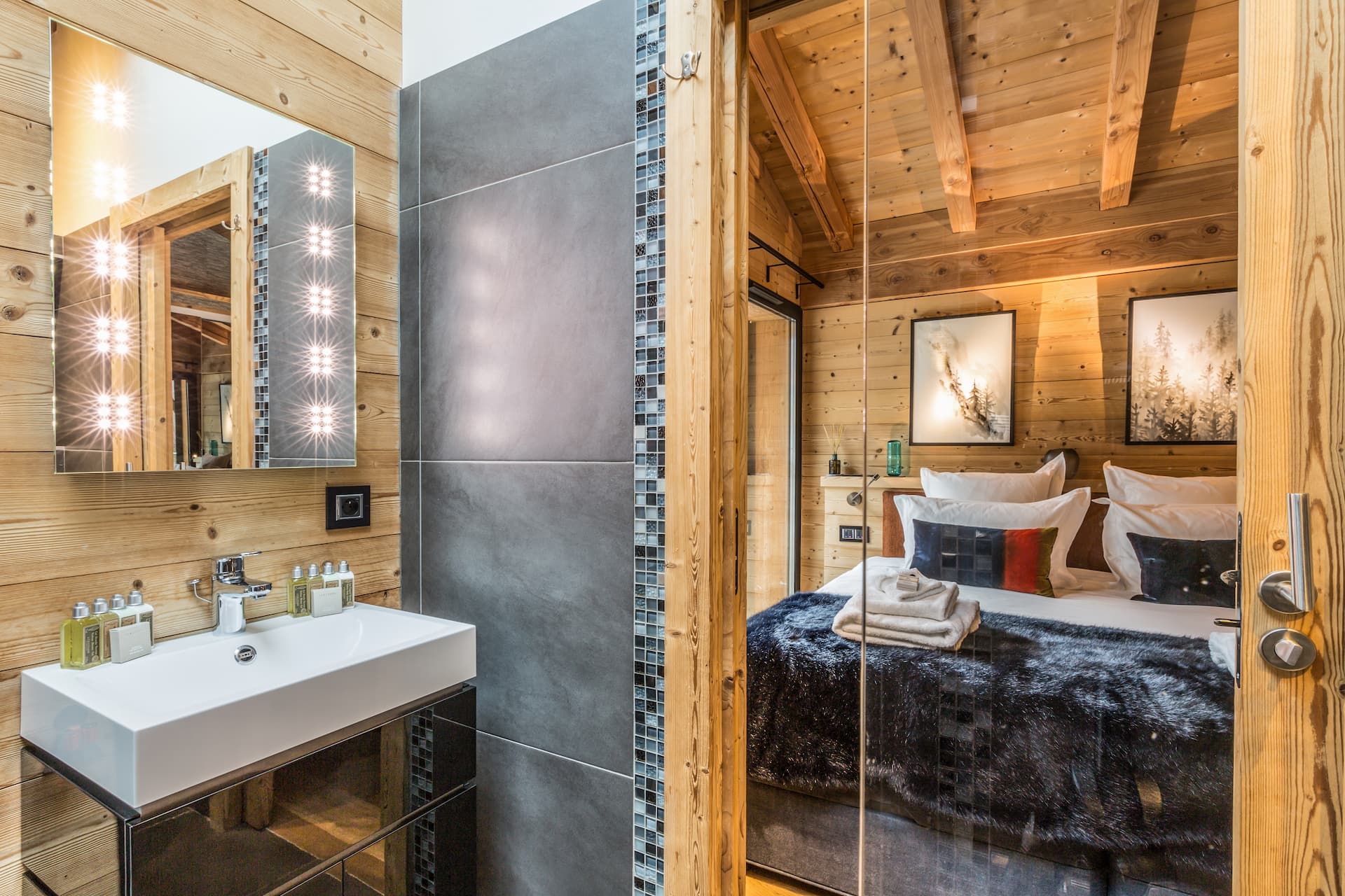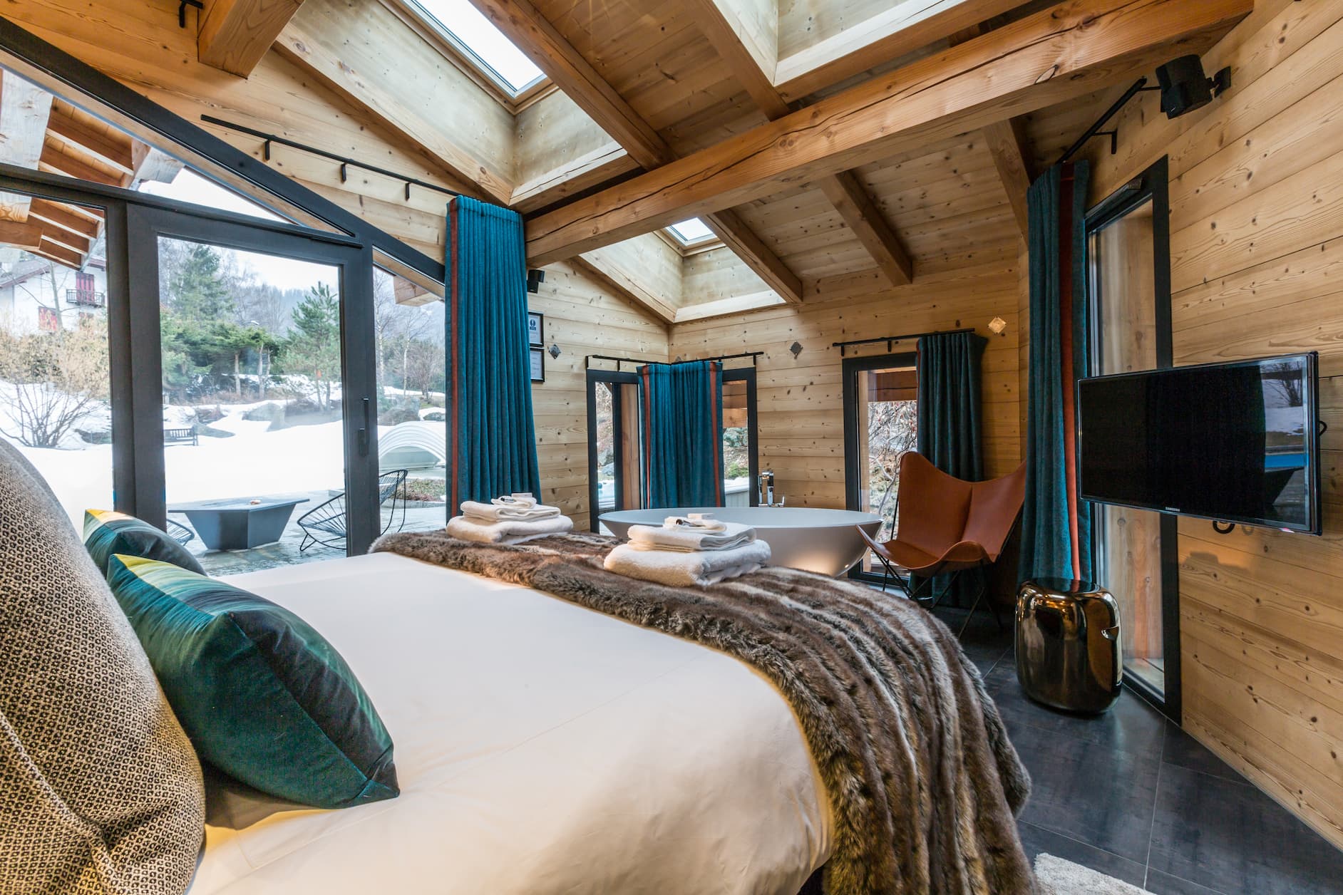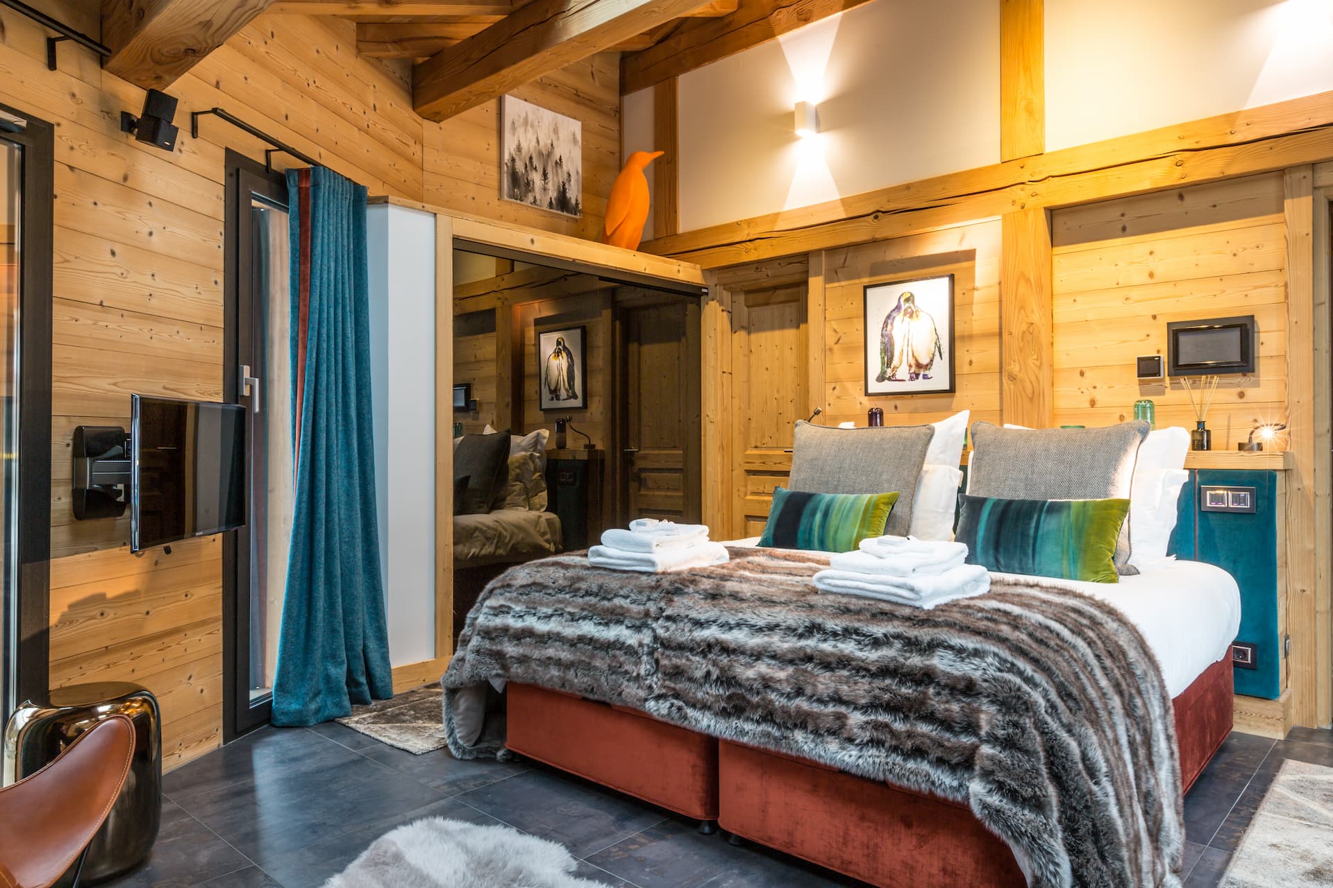 The interiors have been meticulously curated with an eye for both sophistication and warmth. Towering floor-to-ceiling glass windows bathe the open-plan living space in natural light, while timber-beamed ceilings and soft textiles create a cosy yet contemporary ambiance. The living and dining areas flow seamlessly out onto a spacious terrace, where guests can enjoy après-ski drinks from the chalet’s quirky télécabine champagne bar, soak in the bubbling outdoor hot tub, or simply relax and take in the panoramic Alpine scenery.