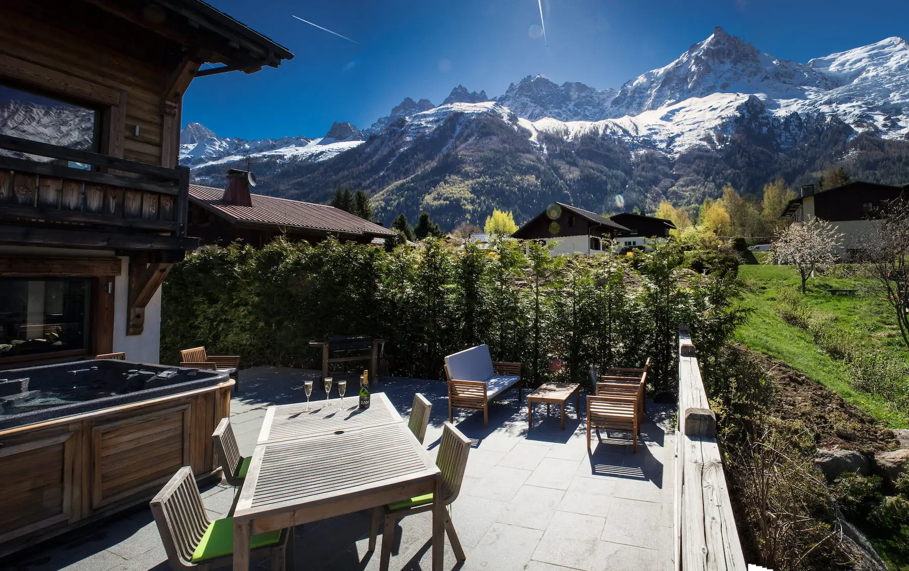 The heart of the chalet is its bright and inviting lounge, where guests can relax by the warmth of a log fire while enjoying satellite TV, surround sound, or a film on the DVD player. The open-plan kitchen is fully equipped with premium appliances, including two ovens, an induction hob, and a built-in coffee machine, making it ideal for both self-catered stays and catered service. Large windows flood the space with natural light and open onto a panoramic terrace where a spacious outdoor jacuzzi provides the perfect place to soak up views of Mont Blanc.