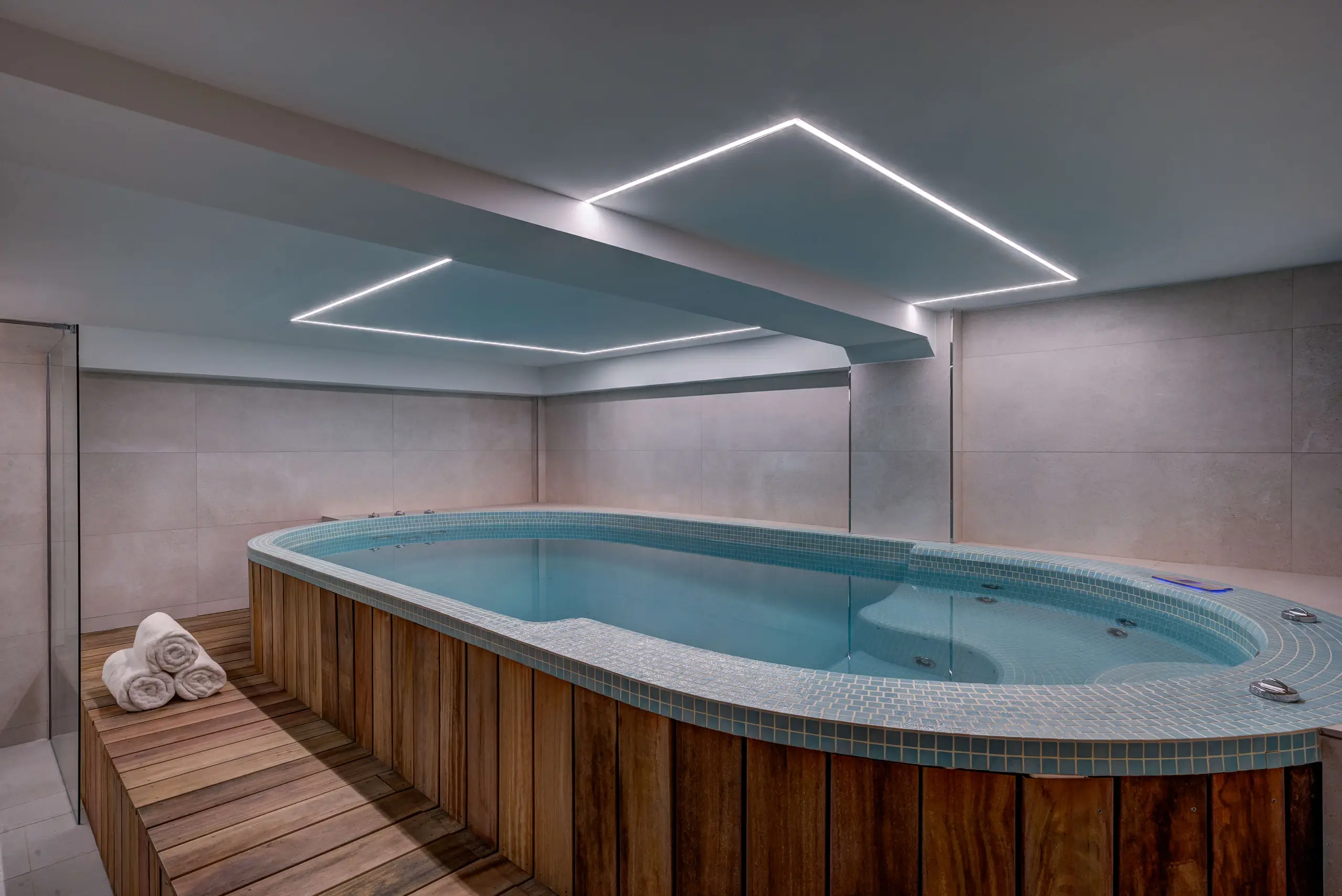 Guests can enjoy a heated indoor pool with resistance setting, a sauna, an outdoor hot tub, and a private cinema room with a social area and Netflix for ultimate relaxation and entertainment.